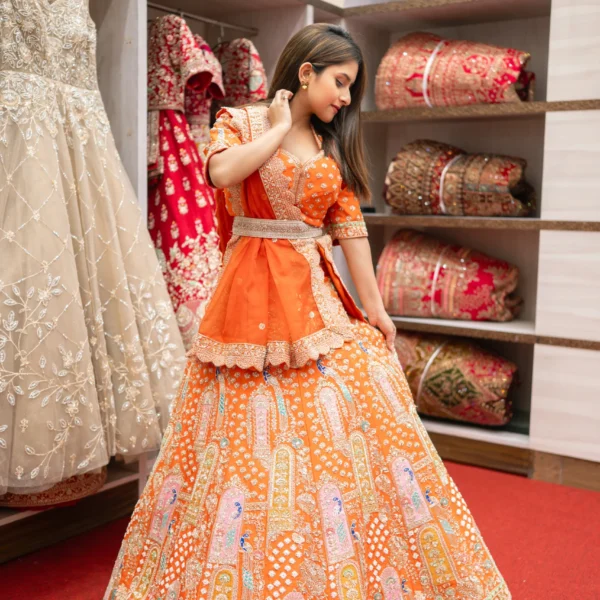 • Rust Orange Handwork Bridal Lehenga With Zari Thread and Zardosi Work Rust Orange Handwork Bridal Lehenga With Zari Thread and Zardosi Work ₹48,500.00